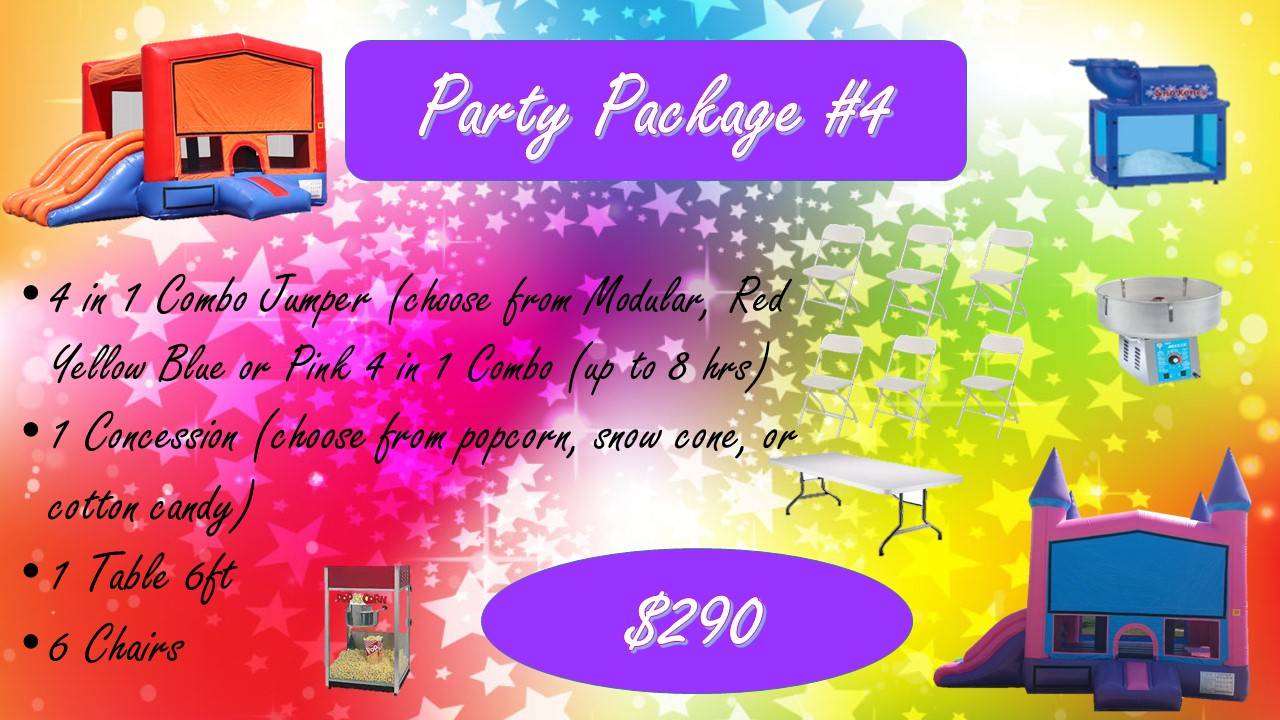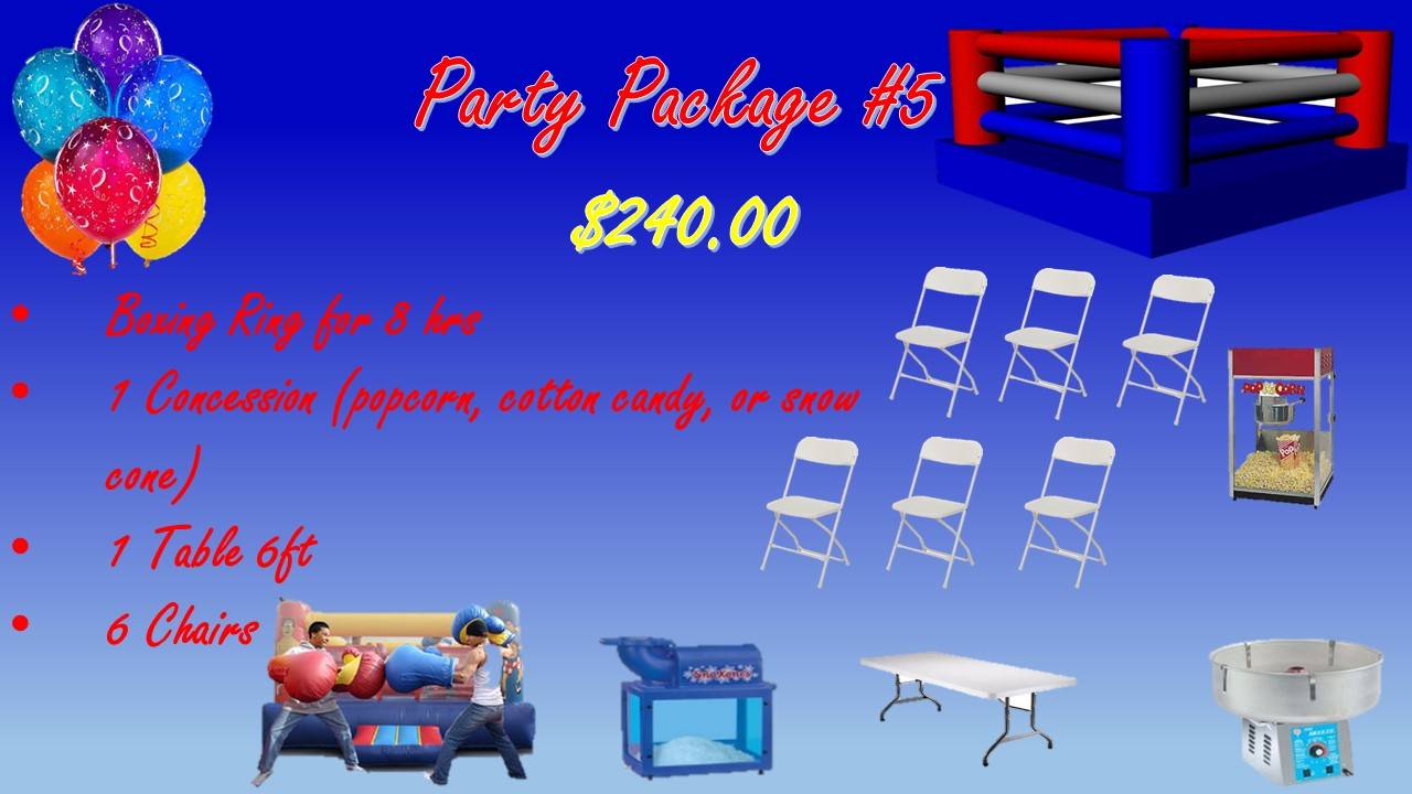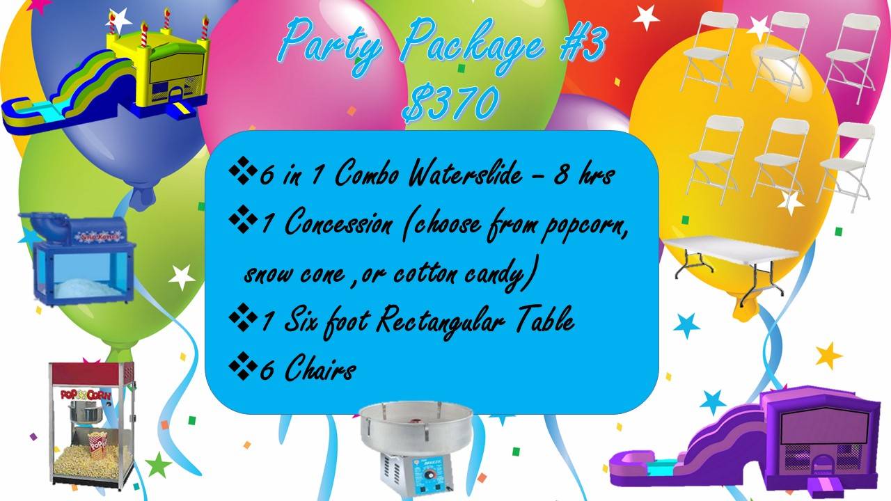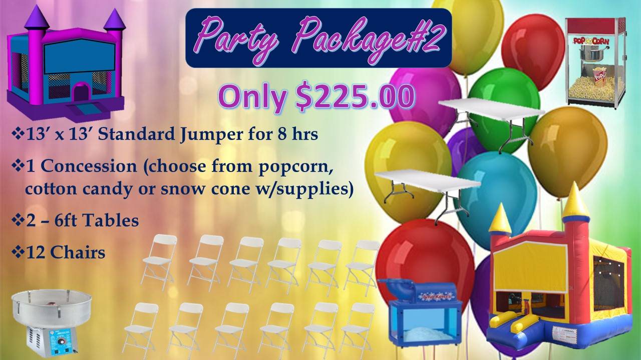 We offer jumper units in numerous sizes from small to large bounce house only units to combo units, waterslides, obstacle course, boxing ring and toddler unit. In addition we also offer concession items including round and rectangular tables, chairs, cotton candy, snow cone, popcorn machines, hot dog steamer and more.
